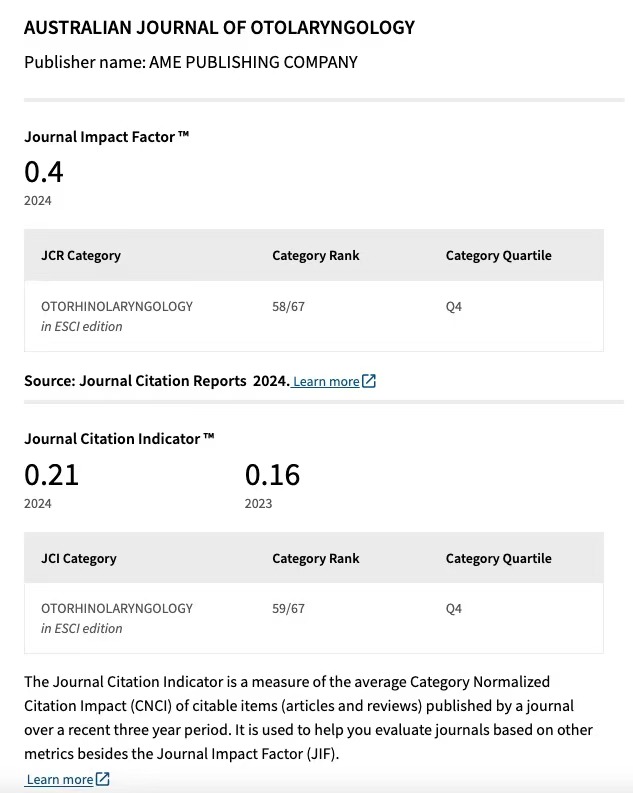 We are pleased to announce that the Australian Journal of Otolaryngology (AJO) has attained its latest impact factor for the 2024 citation year: 0.4 (Figure 1).