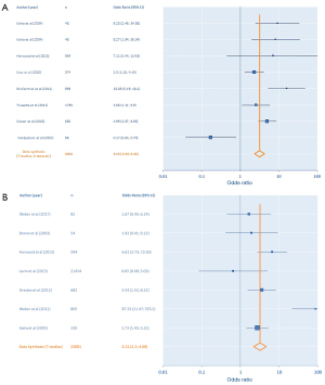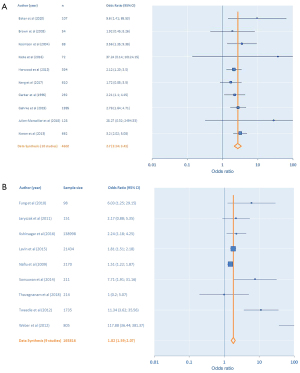 Obesity was defined in adult studies as BMI ≥30 kg/m2 and in pediatric studies as BMI >95th or 97th centile for age. Using these thresholds, from nine studies (16,24,31,40-45), pediatric obesity in patients undergoing oropharyngeal surgery confers OR =1.82 (95% CI: 1.59–2.07) of CC (Figure 2B). The two adult studies (21,46) (both sinonasal surgery) that assessed BMI ≥30 kg/m2 as a threshold found that obesity was not a statistically significant risk factor for CC in adults undergoing sinonasal surgery, with OR =1.54 (95% CI: 0.96–2.47).