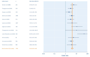 In addition to the number of subjects studied (n) and number of patients meeting outcome criteria, meta-analysis of each risk factor involved the collection of the total number of participants with the risk factor, and the number with the risk factor who met outcome criteria for CC. These numbers were also imputed where necessary and appropriate, either from reported statistics or from odds ratios (ORs). Where both univariate and multivariate analysis had been performed within an individual study, the multivariate results were preferentially used. These risk factors, as categorical variables, were then used to compute ORs with 95% confidence intervals (CIs) for each study assessing individual risk factors. The ORs were synthesized in Mix 2.0 (BiostatXL, Mountain View, CA, USA) using a fixed effects model into a summary OR and CI for each risk factor.