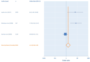 Three studies (7,27,56) on concomitant adult sinonasal and oropharyngeal surgery, which found OR =1.51 (95% CI: 0.96–2.39) for CC, suggested there is not a statistically significant increase in risk of CC conferred by the concomitant surgeries (Figure 5).