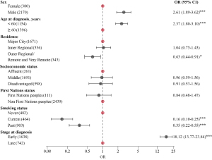 Multivariable analysis showed that several factors were independently associated with p16-positive status (Figure 1). Male OPC patients were more likely to be p16-positive than females (OR =2.61; 95% CI: 1.89–3.62; P<0.001), as were patients aged 60 years or older compared to those under 60 (OR =2.37; 95% CI: 1.80–3.10; P<0.001). Patients presenting with early-stage disease were far more likely to be p16-positive compared to those with advanced-stage disease (OR =18.12; 95% CI: 13.77–23.84; P<0.001). In contrast, current smokers (OR =0.16; 95% CI: 0.10–0.25) and former smokers (OR =0.35; 95% CI: 0.22–0.55) were significantly less likely to be p16-positive compared to never smokers (P<0.001 for both). Similarly, patients living in outer regional, remote or very remote areas had significantly lower odds of being diagnosed with p16-positive disease compared to those in major cities (OR =0.63; 95% CI: 0.44–0.91; P=0.01).