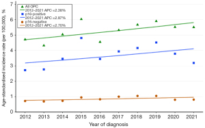 ASR trends for OPC, including overall and stratified by p16 status, are presented in Figure 2. A marginally significant upward trend was observed from 2012 to 2021 in the overall incidence rates of OPC (including cases with unknown p16 status), with an APC of +2.4% (95% CI: −0.2% to +4.9%, P=0.07). Similar non-significant increasing trends were exhibited from 2012 to 2021 by p16 status: APC of +2.9% (95% CI: −3.3% to +9.4%; P=0.33) for the p16-positive group and +2.7% (95% CI: −4.1% to +9.8%; P=0.39) for the p16-negative group.