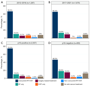 Details of treatment modalities in OPC patients, stratified by diagnosis period and p16 status, are presented in Figure 3. Overall, 92% (n=2,710) of the cohort received treatment, including RT (84%, n=2,472) and intravenous systemic therapy (IVST; 73%, n=2,155) with individuals represented across one or more treatment modalities. Concurrent RT/IVST was the most common treatment modality, administered to 66% (n=1,947) of patients. This was followed by RT alone in 12% (n=355), surgery-based treatments in 8% (n=238). IVST alone in 4% (n=105), and non-concurrent RT/IVST in 2% (n=65). The percentage of patients who received treatment remained stable between 2012–2016 and 2017–2021 (92% vs 91%, P=0.59). However, a significant shift in treatment modalities was observed between the two diagnosis periods (P<0.001; Figure 3A,3B). The proportion of patients undergoing surgery-based treatment increased from 6% in 2012–2016 to 10% in 2017–2021. RT treatment increased from 81% (n=1,047) to 85% (n=1,427) over this period. Systemic therapy increased in total numbers, 982 to 1173, but declined as a percentage of cases from 76% to 70%. Treatment varied by p16 status, with 95% (n=1,958) of p16-positive and 87% (n=431) of p16-negative patients receiving treatment (P<0.001; Figure 3C,3D). People with p16-positive disease were more likely to receive concurrent RT/IVST compared to their p16-negative counterparts (74% vs. 47%). In contrast, p16-negative patients were more likely to undergo surgery-based treatments (15% vs. 6%) or receive RT alone (10% vs. 7%) than p16-positive patients.