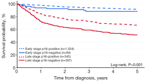 There were significant differences in 5-year DSS across the four groups stratified by p16 status and disease stage (P<0.001; Figure 4). Overall, patients with early-stage disease had better survival outcomes than those with late-stage disease. Within both early- and late-stage groups, p16-positive patients showed improved survival compared to p16-negative patients. However, this difference was only statistically significant in late-stage disease (log-rank P<0.001), but not in early-stage disease (log-rank P=0.15). The unadjusted 5-year DSS of the four groups ranked from best to worse was: early-stage p16-positive (92%; 95% CI: 90–93%), early-stage p16-negative (88%; 95% CI: 82–96%), late-stage p16-positive (67%; 95% CI: 62–72%), and late-stage p16-negative (51%; 95% CI: 46–57%).