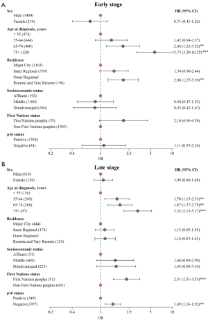 After adjusting for potential confounding factors (Figure 5), it was again observed that p16-negative status was significantly associated with worse survival in late-stage disease (HR =1.49; 95% CI: 1.16–1.92; P=0.002), whereas no significant association was observed between p16 status and survival in early-stage disease (P=0.77). Additionally, increasing age at diagnosis was associated with worse survival outcomes regardless of disease stage. In the early-stage group (Figure 5A), the 65–74 years (HR =2.06; 95% CI: 1.21–3.52; P=0.008) and 75+ years (HR =5.73; 95% CI: 3.20–10.25; P<0.001) age groups were associated with worse survival compared to people under 55 years old, while the 55–64 years group showed no significant difference. In the late-stage group (Figure 5B), compared to individuals under 55 years, those aged 55–64 (HR =1.70; 95% CI: 1.15–2.51; P=0.008), 65–74 years (HR =1.87; 95% CI: 1.27–2.75; P=0.002), and 75+ years (HR =3.32; 95% CI: 2.13–5.17; P<0.001) had significantly poorer survival. Survival was worse for First Nations peoples, with a significant association observed in those with late-stage disease (HR =2.31; 95% CI: 1.51–3.53; P<0.001) and a marginal association noted in those with early-stage disease (HR =2.10; 95% CI: 0.96–4.48; P=0.06), while people from outer regional, remote or very remote areas had significantly lower survival compared to those from major cities for early-stage disease only (HR =2.08; 95% CI: 1.27–3.39; P=0.003).