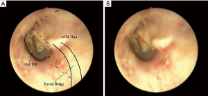 Figure 1A,1B show an endoscopic image of a left MRM obliteration 6 years post-operatively. A middle temporal artery flap was placed on Bonalive® glass used in this patient to obliterate the mastoid cavity.