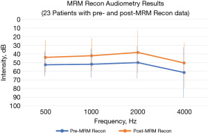 - Calculate mean audiometry air conduction changes from pre- to post- MRM obliteration;
